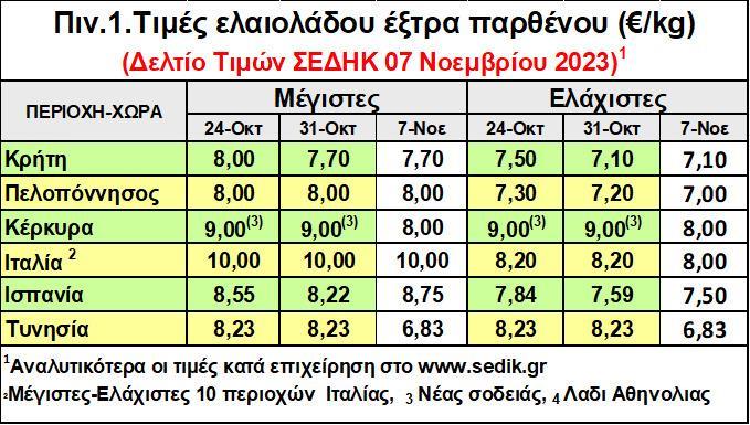 *Στην Κρήτη, κυμάνθηκαν μεταξύ 7,10-7,70 ευρώ / κιλό, στην Πελοπόννησο, μεταξύ 7,00-8,00 ευρώ / κιλό και στη Κέρκυρα στα 8 ευρώ /κιλό