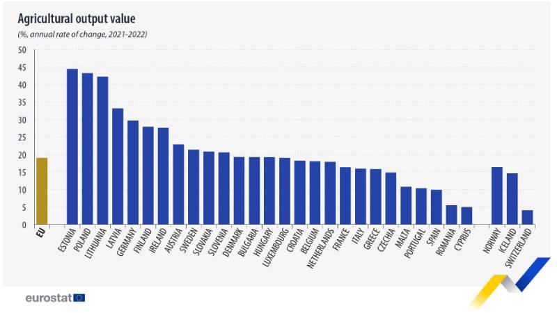 Όλες οι χώρες της Ένωσης κατέγραψαν αύξηση της αξίας της γεωργικής παραγωγής το 2022 σε σύγκριση με το 2021. Τα υψηλότερα ποσοστά αύξησης καταγράφηκαν στην Εσθονία (+44%), την Πολωνία (+43%) και τη Λιθουανία (+42%).