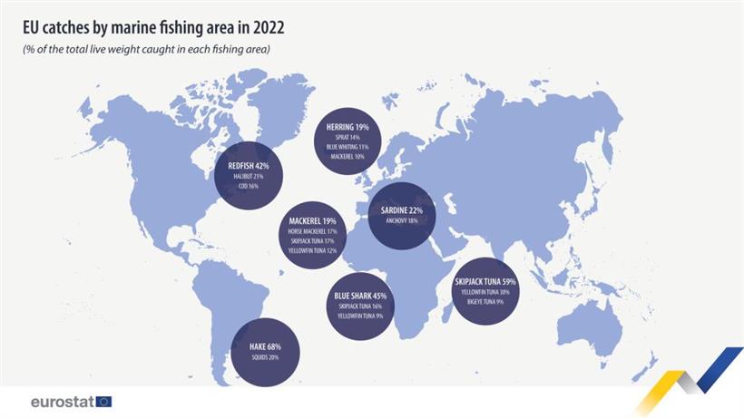 Μόνο το 6% των συνολικών αλιευμάτων της ΕΕ αλιεύθηκε σε τρεις θαλάσσιες περιοχές. Τα κυριότερα είδη που αλιεύτηκαν σε αυτές ήταν: μερλούκιος (Ατλαντικός, νοτιοδυτική περιοχή), μπλε καρχαρίες και τόνος παλαμίδας (Ατλαντικός, νοτιοανατολική περιοχή) και κοκκινόψαρο, ιππόγλωσσα και μπακαλιάρος (Ατλαντικός, βορειοδυτική περιοχή).