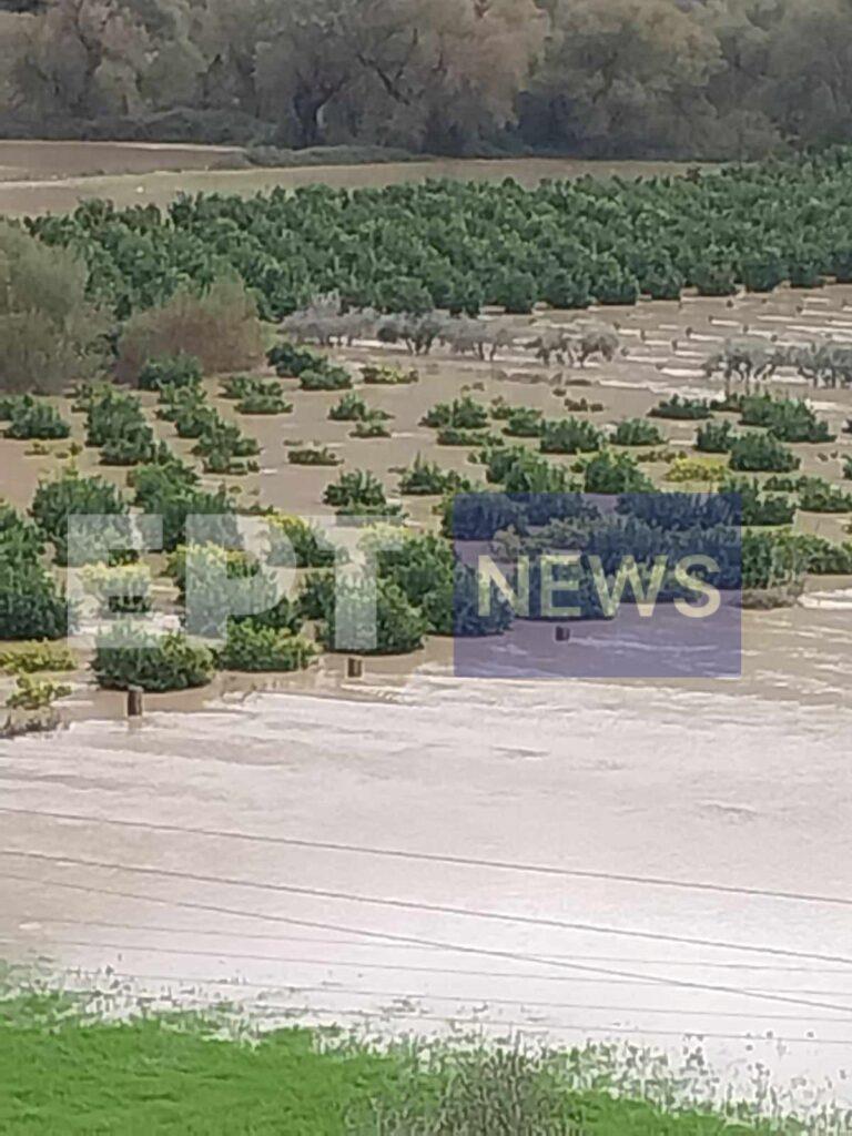 Μέσα στα νερά και τις λάσπες βρίσκονται χιλιάδες δέντρα εσπεριδοειδών – κυρίως μανταρίνια και πορτοκάλια αλλά και καλλιέργειες ψυχανθών (μηδική, τριφύλλι κλπ), χωρίς αυτή τη στιγμή να μπορεί να γίνει ακριβής εκτίμηση της ζημιάς.