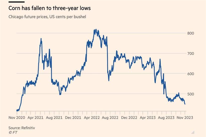«Η τιμή του καλαμποκιού έπεσε σε χαμηλό τριών ετών, καθώς οι προμήθειες από τις ΗΠΑ και τη Βραζιλία αυξάνονται, ενώ η ζήτηση παραμένει στάσιμη, συμβάλλοντας στην αποκλιμάκωση του πληθωρισμού των τιμών των τροφίμων, αλλά αυξάνοντας την πίεση στους αγρότες που ανέμεναν ότι οι υψηλές τιμές θα διαρκέσουν», αναφέρουν σε δημοσίευμά τους οι Financial Times.