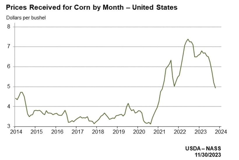 Στη χθεσινή μηνιαία έκθεσή της για τις γεωργικές τιμές, η Εθνική Υπηρεσία Γεωργικών Στατιστικών (NASS) του USDA ανέφερε ότι: "Η τιμή του καλαμποκιού, στα 4,93 δολάρια ανά μπούσελ, είναι μειωμένη κατά 28 σεντς σε σχέση με τον προηγούμενο μήνα και κατά 1,56 δολάρια σε σχέση με τον Οκτώβριο του 2022".
