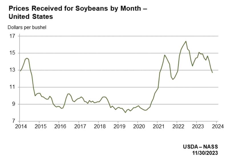 Όσον αφορά τη σόγια, η έκθεση NASS Prices ανέφερε ότι: "Η τιμή της σόγιας, στα 12,70 δολάρια ανά μπούσελ, είναι 50 σεντς χαμηλότερη από τον Σεπτέμβριο και 80 σεντς χαμηλότερη από τον Οκτώβριο του προηγούμενου έτους".