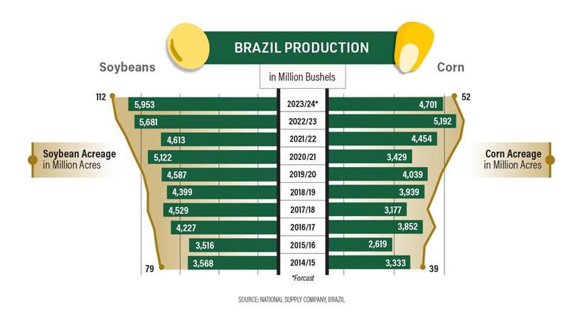 Ακολουθεί μια μικρή προοπτική για το πόσο έχει αυξηθεί η παραγωγή σόγιας και καλαμποκιού στη Βραζιλία την τελευταία δεκαετία. Το 2014, η Βραζιλία παρήγαγε 10% λιγότερη σόγια από τις ΗΠΑ. Τώρα, παράγει 45% περισσότερη, ακόμη και με τις ΗΠΑ να αυξάνουν την παραγωγή κατά 10% κατά τη διάρκεια αυτής της περιόδου.