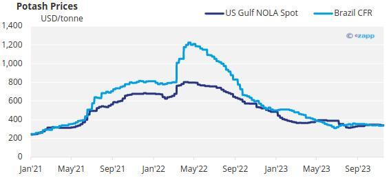 Οι τιμές της ποτάσας φάνηκαν αδύναμες αυτή την εβδομάδα εν μέσω έλλειψης ζήτησης και άφθονης προσφοράς, συμπεριλαμβανομένης της προσφοράς από την υπό κυρώσεις Λευκορωσία. Οι αγορές ήταν συγ4κρατημένες με τις τιμές της κοκκώδους ποτάσας στη Βραζιλία να υποχωρούν περαιτέρω κατά 5 USD/τόνο και να φθάνουν σε ένα εκτιμώμενο εύρος 335-350 USD/τόνο CFR. Αναμένεται ότι οι τιμές θα μπορούσαν να μειωθούν περαιτέρω τις επόμενες εβδομάδες λόγω της έλλειψης ζήτησης από τους αγρότες της Βραζιλίας.