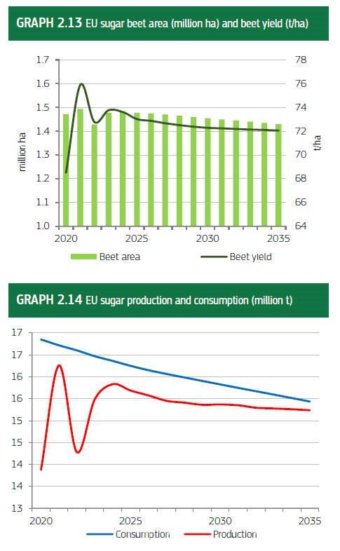 Ως αποτέλεσμα της χαμηλότερης έκτασης και απόδοσης, η παραγωγή ζάχαρης στην Ε.Ε. αναμένεται να μειωθεί αργά, από 15,7 Mt μέσο όρο το 2024-2026 σε 15,3 Mt το 2035.