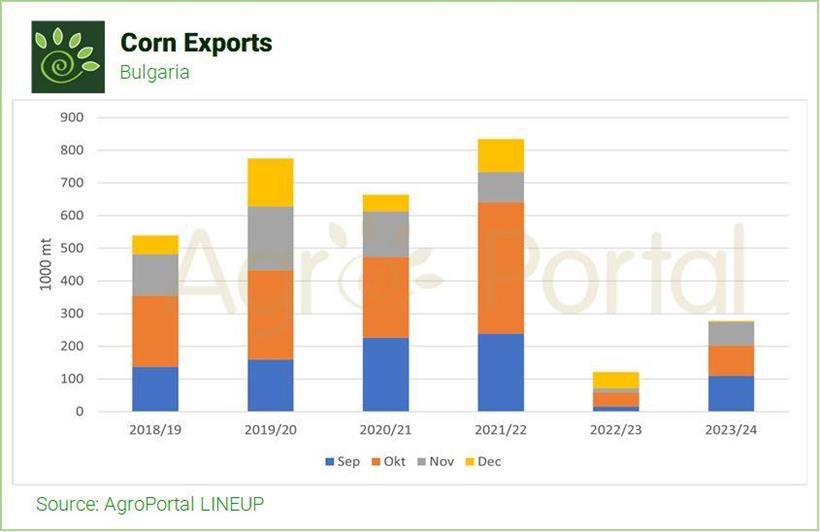 Σύμφωνα με τα στοιχεία της LINEUP, οι εξαγωγές καλαμποκιού από τη Βουλγαρία για την περίοδο Ιουλίου-Νοεμβρίου 2023 ανήλθαν σε 0,28 εκατομμύρια τόνους, αυξημένες κατά 133% σε σχέση με την αντίστοιχη περίοδο του προηγούμενου έτους.