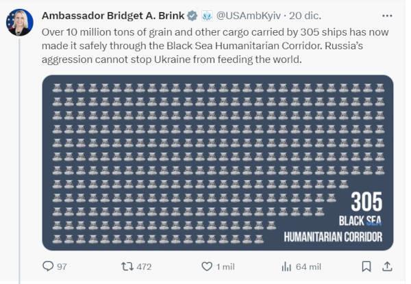 Μέχρι τώρα περισσότεροι από 10 Mt έχουν μεταφερθεί με 305 πλοία σύμφωνα με την πρέσβη των ΗΠΑ στην Ουκρανία, Bridget A. Brink.