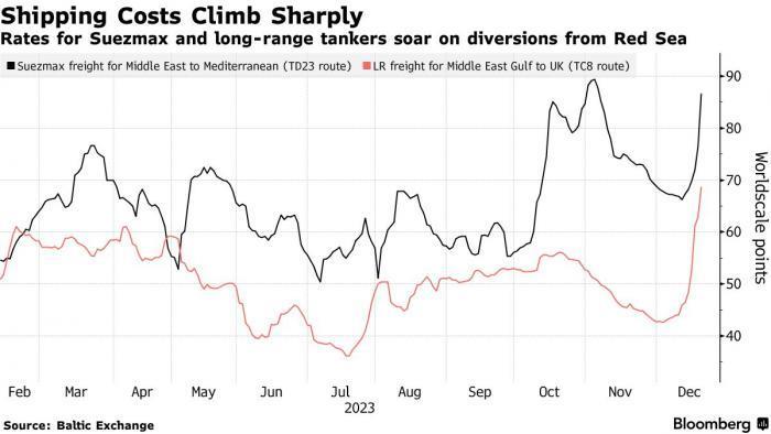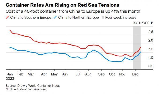 Το κόστος μεταφοράς εμπορευμάτων σε εμπορευματοκιβώτιο 40 ποδιών από την Ασία στη βόρεια Ευρώπη αυξήθηκε κατά 16% την περασμένη εβδομάδα και είναι αυξημένο κατά 41% αυτόν τον μήνα, σύμφωνα με τον παγκόσμιο δείκτη εμπορευματοκιβωτίων Drewry World Container Index. Παρομοίως, οι λογαριασμοί των ναύλων καυσίμων κάνουν άλμα, με ορισμένες μεγάλες πετρελαϊκές εταιρείες και εταιρείες δεξαμενόπλοιων να δηλώνουν ότι θα αποφύγουν τη νότια Ερυθρά Θάλασσα.