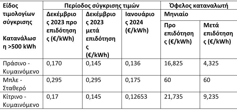 Τιμές πράσινου τιμολογίου για Ιανουάριο 2024