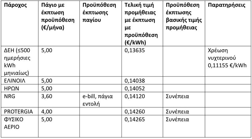 Ο ανταγωνισμός λειτούργησε στο ειδικό, πράσινο τιμολόγιο, με την πλειονότητα των παρόχων να προσφέρει τιμές κάτω των 0,15 ευρώ/kWh και ελάχιστους να κινούνται σε υψηλότερα επίπεδα. Το φθηνότερο πράσινο τιμολόγιο (για καταναλώσεις κάτω των 500 kWh) ανακοινώθηκε από την ΔΕΗ, με την τιμή χρέωσης να διαμορφώνεται σε 0,136 ευρώ/kWh, ακολούθησαν: