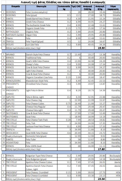 Η μέση τιμή λιανικής πώλησης των τυριών τύπου "φέτας" καναδικής παραγωγής είναι 17,8 ευρώ ανά κιλό, ενώ η μέση τιμή των τυριών τύπου "φέτας" από άλλες χώρες (όπως η Δανία, η Βουλγαρία και οι ΗΠΑ) είναι 23 ευρώ ανά κιλό.