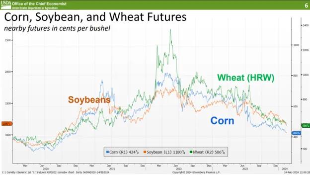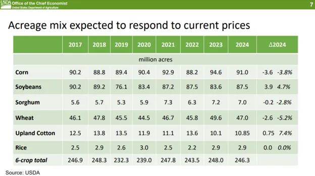 Το USDA διατήρησε τις προβλέψεις του για το καλαμπόκι, τη σόγια και το σιτάρι για το 2024 σε μεγάλο βαθμό σύμφωνες με τις Βασικές Προβλέψεις που δημοσίευσε το περασμένο φθινόπωρο. Για την καλλιεργητική περίοδο του 2024, οι οικονομολόγοι αναμένουν ότι οι Αμερικανοί αγρότες θα πραγματοποιήσουν πιθανότατα μια αλλαγή 1:1 στα στρέμματα καλαμποκιού και σόγιας.