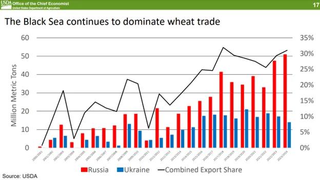 Και οι δύο χώρες ελέγχουν το 31% των παγκόσμιων εξαγώγιμων προμηθειών σιταριού.