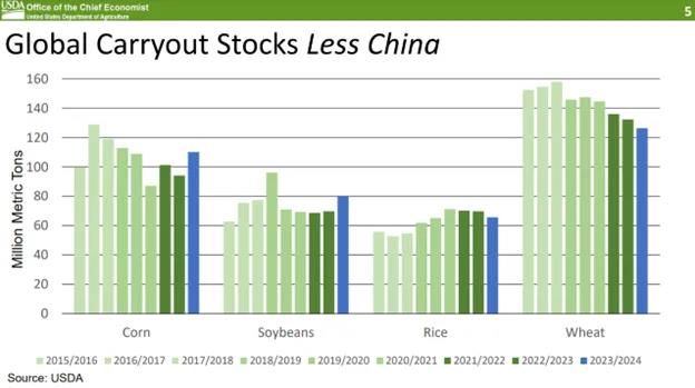 Ο επικεφαλής οικονομολόγος του USDA, Seth Meyer, ανέφερε την άνοδο του παγκόσμιου όγκου μεταφοράς καλαμποκιού και σόγιας (χωρίς να περιλαμβάνονται τα αποθέματα της Κίνας) ως τη δύναμη πίσω από την αλλαγή στρεμμάτων καλαμποκιού-σογιας, ενώ τα σφιχτότερα τελικά αποθέματα σιταριού και ρυζιού θα διατηρήσουν αυτά τα στρέμματα κάπως ανταγωνιστικά αυτή την άνοιξη.