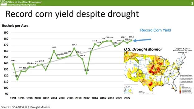 Ο Meyer υπογράμμισε την ανθεκτικότητα της αμερικανικής φυτικής παραγωγής όταν αναφέρθηκε στις αποδόσεις, σημειώνοντας ότι παρά τις λιγότερο από ιδανικές συνθήκες καλλιέργειας στην Heartland πέρυσι, όταν μια ξηρασία στις αρχές της περιόδου θα είχε καταστρέψει τις καλλιέργειες καλαμποκιού και σόγιας χωρίς έγκαιρες βροχές στις περιόδους αιχμής της επικονίασης και του γεμίσματος των λοβών, οι αποδόσεις των αμερικανικών καλλιεργειών εξακολουθούν να είναι λογικά σε απόσταση αναπνοής από τις προβλέψεις της γραμμής τάσης.