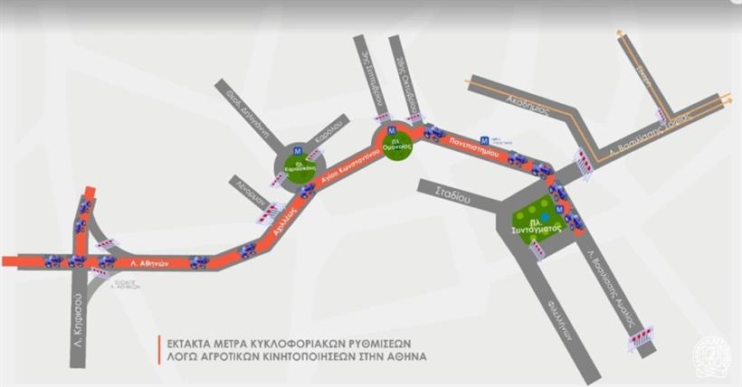 -Προσωρινή διακοπή της κυκλοφορίας κατά μήκος του δρομολογίου που θα ακολουθήσουν τα αγροτικά οχήματα: Λεωφόρος Αθηνών, Αχιλλέως, πλατεία Καραϊσκάκη. Θα κινηθούν αντίθετα στην οδό Αγίου Κωνσταντίνου, την πλατεία Ομονοίας και την οδό Πανεπιστημίου, προκειμένου να φθάσουν στο Σύνταγμα. Θα υπάρξει προσωρινή διακοπή της κυκλοφορίας πέριξ της πλατείας Ομονοίας.
