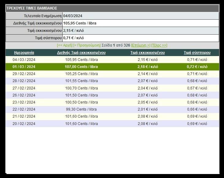 Η τιμή εκκοκκισμένου βαμβακιού στην Ελλάδα ανέρχεται πλέον στα 2,15 €/κιλό, από 2,18 €/κιλό την 1η Μαρτίου.