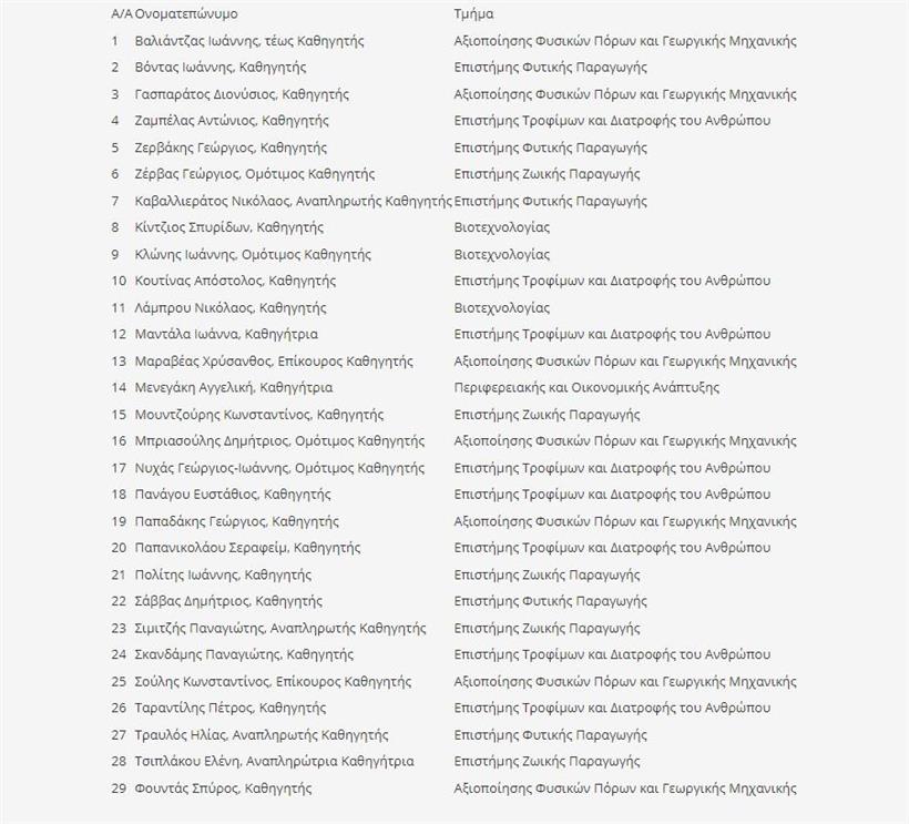 Τα είκοσι εννέα μέλη της ακαδημαϊκής κοινότητας του Γεωπονικού Πανεπιστημίου Αθηνών που συγκαταλέγονται στη λίστα αναφέρονται στον πίνακα που ακολουθεί με αλφαβητική σειρά: