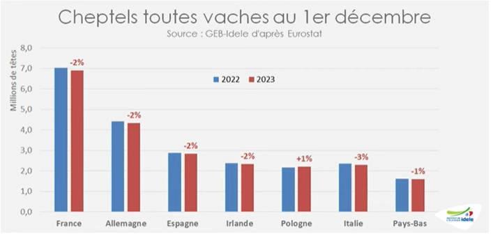 Συγκεκριμένα, σύμφωνα με στην τελευταία έκθεση της Idele Milk - Meat Trends αναφέρεται: -3% στην Ιταλία, -2% στη Γαλλία, τη Γερμανία, την Ιρλανδία και την Ισπανία, -1% στην Ολλανδία.