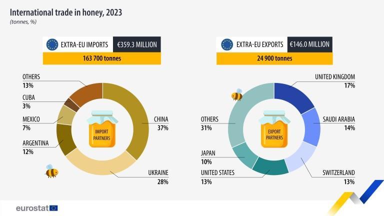 Η Ευρωπαϊκή Ένωση εισήγαγε 163.700 τόνους φυσικού μελιού το 2023 από χώρες εκτός ΕΕ αξίας 359,3 εκατομμυρίων ευρώ.