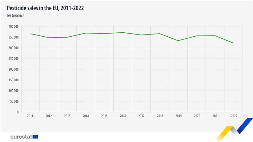 Η ποσότητα των φυτοφαρμάκων που πωλήθηκαν στην ΕΕ το 2022 μειώθηκε απότομα, σε μεγάλο βαθμό λόγω της εκτίναξης των τιμών. Περίπου 322 000 τόνοι φυτοφαρμάκων πωλήθηκαν το 2022, μειωμένοι κατά 10% σε σχέση με την ποσότητα που πωλήθηκε το 2021.