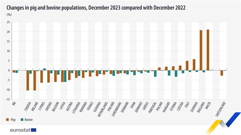 Η Κροατία και η Ιρλανδία κατέγραψαν απότομες μειώσεις στους πληθυσμούς χοίρων τους (-10% σε σύγκριση με το 2022), ενώ η Βουλγαρία και η Μάλτα κατέγραψαν ακόμη πιο απότομες αυξήσεις (και οι δύο +21%).