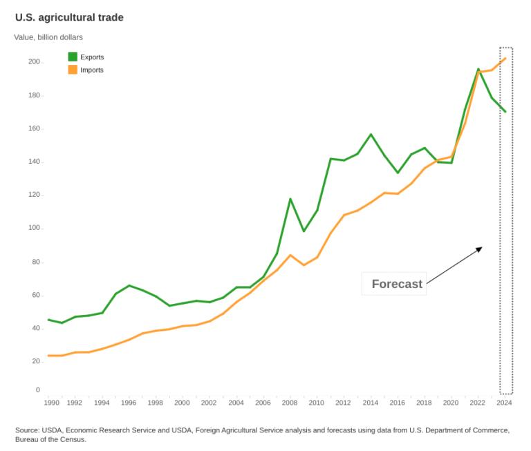 Το έλλειμμα του γεωργικού εμπορίου των Ηνωμένων Πολιτειών αναμένεται να αυξηθεί και πάλι στα 32 δισεκατομμύρια δολάρια το οικονομικό έτος 2024, μια αύξηση 1,5 δισεκατομμυρίου δολαρίων από την πρόβλεψη του Φεβρουαρίου, σύμφωνα με την έκθεση της Υπηρεσίας Οικονομικών Ερευνών του USDA για τις προοπτικές του γεωργικού εμπορίου των ΗΠΑ για το 2024, η οποία δημοσιεύεται κάθε τρίμηνο.