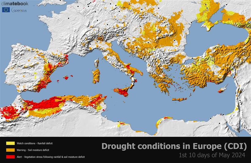 Ο σύνθετος δείκτης ξηρασίας (CDI) στις αρχές Μαΐου 2024 έδειξε ότι η ανατολική Ισπανία, το μεγαλύτερο μέρος της νότιας και κεντροανατολικής Ιταλίας, η Μάλτα, το μεγαλύτερο μέρος της Ρουμανίας, το μεγαλύτερο μέρος της Ελλάδας, τα βόρεια Βαλκάνια, η δυτική Κύπρος, τα νησιά της Μεσογείου και το μεγαλύτερο μέρος της Τουρκίας ήταν σε σύνθετες προειδοποίησης (Warning-πορτοκαλί) με έλλειμμα βροχοπτώσεων, όπως φαίνεται στην παρακάτω εικόνα.