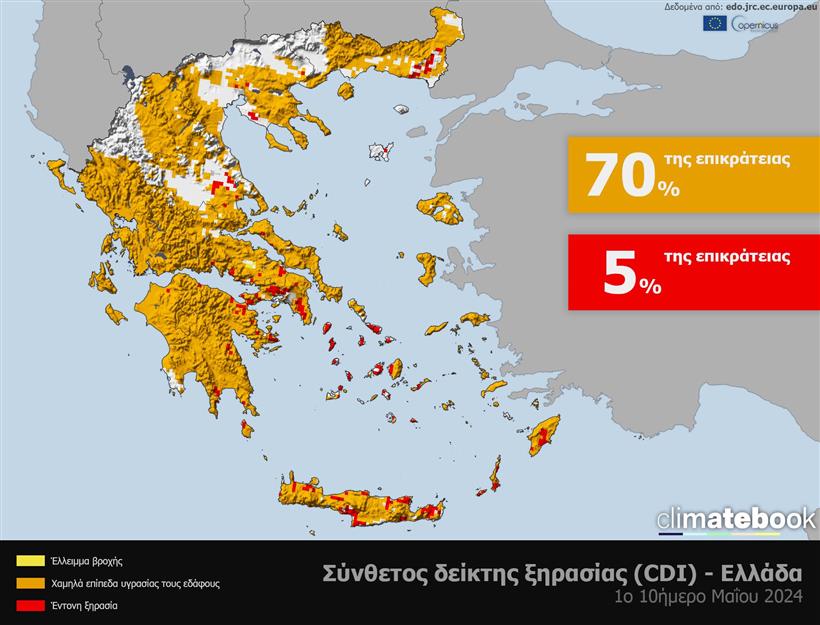 Έντονες συνθήκες ξηρασίας επικράτησαν το 1ο δεκαήμερο του Μαΐου 2024 στην Ελλάδα (και επικρατούν μέχρι και τις αρχές Ιουνίου 2024) όπου το 70% της επικράτειας σύμφωνα με το σύνθετο δείκτη ξηρασίας (CDI) ήταν σε κατάσταση προειδοποίησης με χαμηλά επίπεδα υγρασίας του εδάφους.