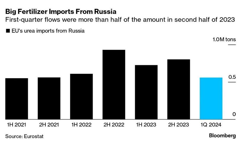 Σύμφωνα με το γράφημα, οι εισαγωγές ουρίας στην ΕΕ από τη Ρωσία παρουσίασαν άνοδο το πρώτο τρίμηνο του 2024, αγγίζοντας τα 521.000 τόνους, 16% υψηλότερα από το αντίστοιχο διάστημα του 2023. Η τάση αυτή έρχεται σε αντίθεση με τις ανησυχίες που εκφράζονται από την ευρωπαϊκή βιομηχανία λιπασμάτων, η οποία φοβάται ότι η εξάρτηση από τα ρωσικά λιπάσματα θα υπονομεύσει την εγχώρια παραγωγή και θα θέσει σε κίνδυνο την επισιτιστική ασφάλεια.