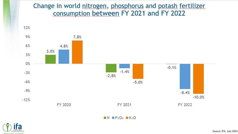 Επιπλέον, για το ίδιο διάστημα, η κατανάλωση χρήσης φωσφόρου (P2O5) και ποτάσας (K2O) μειώθηκε για δεύτερο συνεχόμενο έτος, κατά 8% σε 44 Mt και κατά 10% σε 35 Mt αντίστοιχα.