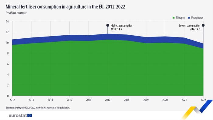 Σύμφωνα με στοιχεία της Eurostat, η ποσότητα ορυκτών λιπασμάτων (αζώτου και φωσφόρου) που χρησιμοποιήθηκαν στη γεωργική παραγωγή σε ολόκληρη την ΕΕ έφτασε τα 9,8 εκατομμύρια τόνους το 2022. Αυτό αντιπροσωπεύει όχι μόνο την ετήσια μείωση 10,3%, αλλά και μια σωρευτική μείωση 15,9% από την κορύφωση του 2017.