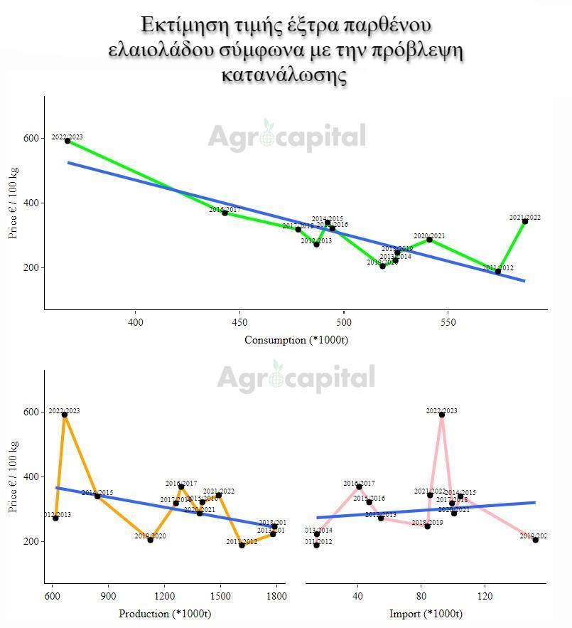 Στην Ελλάδα, η αγορά των Χανίων είδε το έξτρα παρθένο ελαιόλαδο να πωλείται σε τιμές που κυμαίνονταν μεταξύ 182 € και 860 € ανά 100 κιλά την τελευταία δεκαετία, με μέση τιμή 319,7 € ανά 100 κιλά. Η ΔΟΕ κατέγραψε άνοδο 32,2% στην τιμή του έξτρα παρθένου στην Ελλάδα, φτάνοντας τα 780 € ανά 100 κιλά.