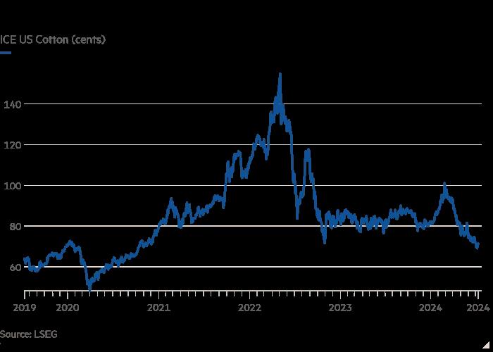 Τα συμβόλαια μελλοντικής εκπλήρωσης για το βαμβάκι ICE έπεσαν κάτω από τα 0,69 δολάρια ανά λίβρα αυτόν τον μήνα, το χαμηλότερο επίπεδο από τον Οκτώβριο του 2020 και λιγότερο από το μισό της 10ετούς κορύφωσης που σημειώθηκε τον Μάιο του 2022.