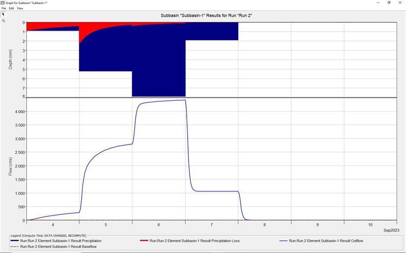 Επιπλέον, αρχικά, στην παρακάτω εικόνα απεικονίζεται το, “προσομοιωμένο ρεαλιστικό”, «ιστόγραμμα βροχόπτωσης» του χρονικού διαστήματος, “04/09-07/09/2023” (“762,40 mm”), (το οποίο και «απέδωσε» την, “προσομοιωμένη ρεαλιστική”, παροχή αιχμής νερού και συγκεκριμένα «4.414,30 κυβικά μέτρα ανά δευτερόλεπτο» ή αλλιώς «4.414,30 m3/sec»), [το οποίο και «απέδωσε», λόγω του ακραίου μετεωρολογικού φαινομένου με την κωδική ονομασία «Daniel», την, “προσομοιωμένη ρεαλιστική”, συνολική ποσότητα νερού, συγκεκριμένα, «700.942.400 κυβικά μέτρα (τόννους νερού)» ή αλλιώς «700.942.400 m3 (τόννους νερού)»], και το αντίστοιχο, “προσομοιωμένο ρεαλιστικό”, «υδρογράφημα πλημμύρας» που προκύπτει από το συγκεκριμένο, “προσομοιωμένο ρεαλιστικό”, επεισόδιο βροχόπτωσης, (λόγω του ακραίου μετεωρολογικού φαινομένου με την κωδική ονομασία «Daniel»), (η ανάλυση και οι υπολογισμοί έγιναν με το ελεύθερο στο διαδίκτυο λογισμικό «HEC-HMS» του «U.S.A. Army Corps of Engineers» δηλαδή του «Σώματος Μηχανικών του Στρατού των Η.Π.Α.») [1,2,4,5,6.1,6.2,7].