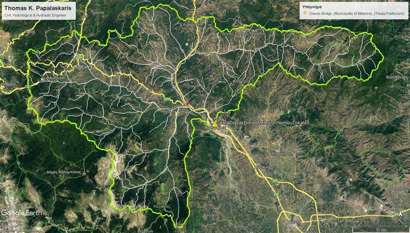 Εικόνα 3. Η απεικόνιση της λεκάνης απορροής, [επιφάνεια με «ανοιχτή πράσινη» απόχρωση, που αντιστοιχεί έως την θέση όπου έχει κατασκευαστεί η «“Ιρλανδική Διάβαση” (“ράμπα”) της “Γέφυρας Διάβας”», (“Δήμου Μετεώρων”), Νομού Τρικάλων”»] και του (πλήρως ανεπτυγμένου) αντίστοιχου, περιεχόμενου σε αυτήν, υδρογραφικού δικτύου (γραμμές με «άσπρη» απόχρωση), του «Ποταμού Πηνειού» επί του υπόβαθρου της διαδικτυακής πλατφόρμας «Google Earth» [1,2,4,10].