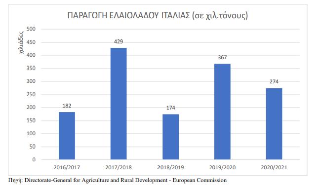 Παρότι η ποσότητα ιταλικού EVOO αυξήθηκε κατά 8,2% σε σχέση με πέρυσι, η σημαντική μείωση των ευρωπαικών ελαιολάδων (-50,1%) οδήγησε στην συνολική πτώση.