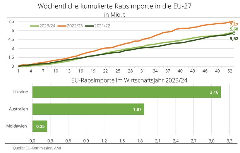 Ο λόγος για τις χαμηλότερες εισαγωγές από την Αυστραλία είναι η χαμηλότερη σοδειά ελαιοκράμβης, η οποία ανήλθε συνολικά σε 4,9 εκατομμύρια τόνους και ήταν περίπου 1,2 εκατομμύρια τόνους χαμηλότερη σε σύγκριση με την περίοδο εμπορίας 2022/2023. Αυτό περιόρισε σημαντικά τις δυνατότητες εξαγωγών.
