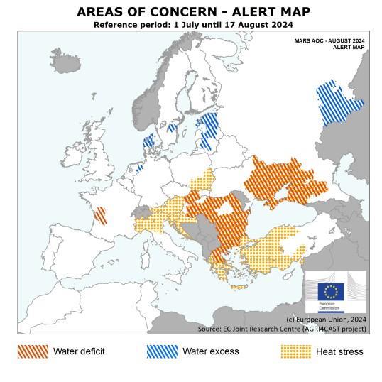 Το πρόγραμμα παρακολούθησης των καλλιεργειών MARS του Κοινού Κέντρου Ερευνών (JARC) της Ευρωπαϊκής Επιτροπής τον Αύγουστο μείωσε δραστικά την πρόβλεψή του για την απόδοση αραβοσίτου, μειώνοντάς την σε 7,03 τόνους/εκτάριο κατά μέσο όρο από την πρόβλεψή του για 7,24 τόνους/εκτάριο τον προηγούμενο μήνα, λόγω του υπερβολικά θερμού κλίματος στη Νοτιοανατολική Ευρώπη.