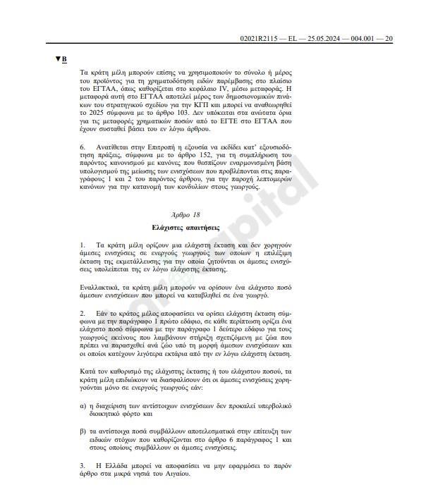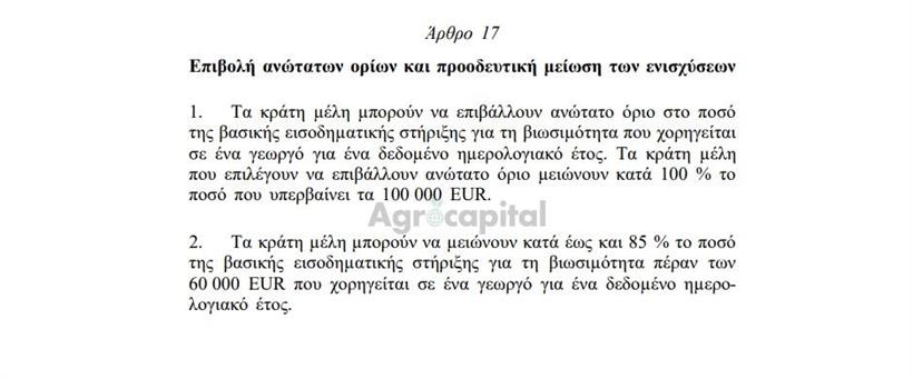 - Τα Κράτη Μέλη έχουν τη δυνατότητα να θέσουν ένα «ταβάνι» στις ενισχύσεις που λαμβάνει ένας αγρότης ετησίως. Ποσά που υπερβαίνουν τις 100.000 ευρώ μπορούν να μειωθούν κατά 100%.
