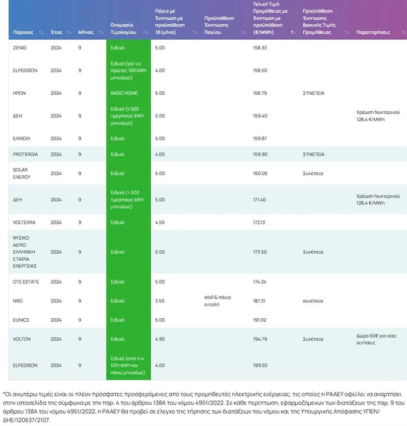 * Elpedison 15,85 σεντς (από 15,85 τον Αύγουστο) ανά κιλοβατώρα για τις πρώτες 100 κιλοβατώρες και 19,95 σεντς (από 19,95 τον Αύγουστο) για τις υπόλοιπες.