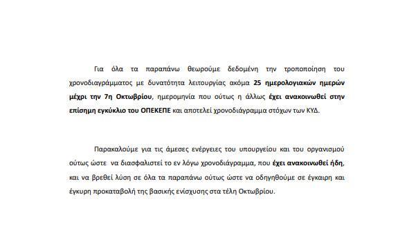 Η ΠΕΦΑΣΥ ζητά την άμεση παρέμβαση του Υπουργείου και του ΟΠΕΚΕΠΕ, προκειμένου να παραταθεί η προθεσμία υποβολής των δηλώσεων κατά 25 ημέρες, μέχρι τις 7 Οκτωβρίου. Επιπλέον, ζητά την άμεση επίλυση των τεχνικών προβλημάτων, την έκδοση των απαραίτητων εγκυκλίων και την παροχή επαρκούς υποστήριξης στα Κέντρα Υποδοχής Δηλώσεων.