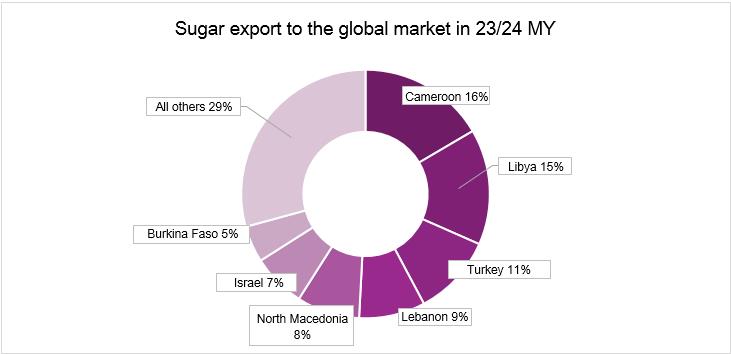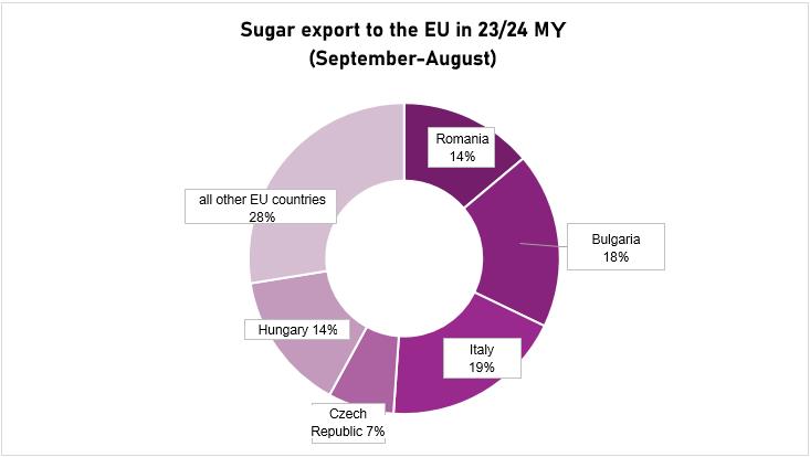 Οι κυριότεροι εισαγωγείς ουκρανικής ζάχαρης μεταξύ των χωρών της ΕΕ είναι η Ιταλία, το μερίδιο της οποίας στις εξαγωγές ουκρανικής ζάχαρης προς την ΕΕ έφθασε το 19%, η Βουλγαρία (18%) και η Ουγγαρία (14%).