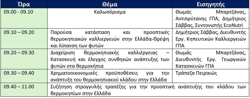Η συνάντηση θα περιλαμβάνει σύντομες παρουσιάσεις από τους Καθηγητές του Γεωπονικού Πανεπιστημίου Αθηνών, Δημήτριο Σάββα (Θρέψη και λίπανση των φυτών) και Θωμά Μπαρτζάνα (Κατασκευή, εξοπλισμός και διαχείριση περιβάλλοντος θερμοκηπίων) και στελεχών της Τράπεζας Πειραιώς σχετικά με τις χρηματοοικονομικές προϋποθέσεις για την ανάπτυξη του θερμοκηπιακού κλάδου στην Ελλάδα.