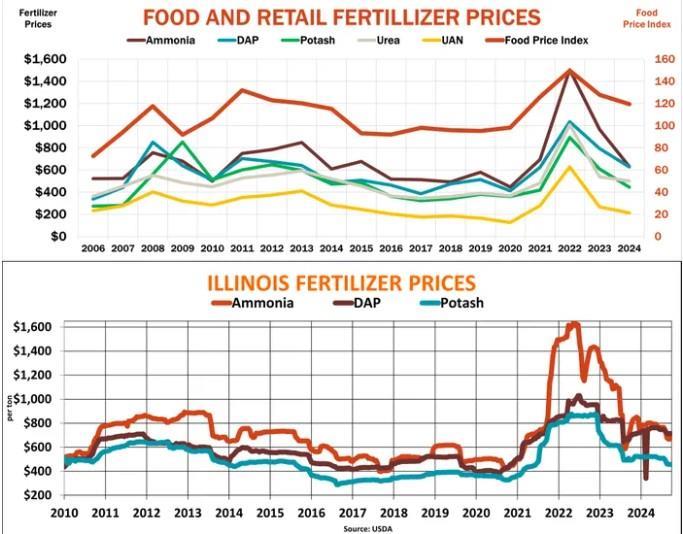 Οι διακανονισμοί αμμωνίας για τα συμβόλαια Οκτωβρίου στον Κόλπο κινήθηκαν επίσης υψηλότερα, αλλά εξακολουθούν να είναι μόλις στο ένα τρίτο της κορυφής που επιτεύχθηκε κατά τη διάρκεια της έκρηξης του πληθωρισμού μετά την πανδημία του 2022. Η ποτάσα στα μετρητά στις μεσοδυτικές πολιτείες βρίσκεται στο χαμηλότερο επίπεδο από τα μέσα του 2021, καθώς το εμπόριο αναμένει ότι οι αγρότες θα ακολουθήσουν τη συνήθη πρακτική τους: θα μειώσουν τις εφαρμογές, θα εξορύξουν το έδαφός τους και θα εξοικονομήσουν μετρητά.