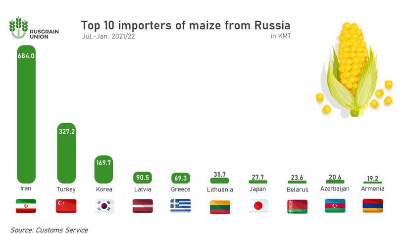 Σύμφωνα με τα τελευταία στοιχεία για τις εισαγωγές καλαμποκιού από τη Ρωσία, η Ελλάδα συγκαταλέγονταν στους δέκα μεγαλύτερους εισαγωγείς για την περίοδο Ιουλίου – Ιανουαρίου 2021/22, με εισαγωγές που ανήλθαν στους 69,3 χιλιάδες μετρικούς τόνους . Αν και η χώρα δεν βρίσκεται στις κορυφαίες θέσεις, η παρουσία της στη λίστα αναδεικνύει τη σταθερή εξάρτησή της από τις ρωσικές αγροτικές εξαγωγές για την κάλυψη των εγχώριων αναγκών.