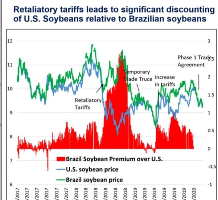Η σόγια της Βραζιλίας διαπραγματευόταν με premium 2,50 δολάρια ανά bu. έναντι της αμερικανικής σόγιας κατά περιόδους κατά τη διάρκεια της διετούς διαμάχης.