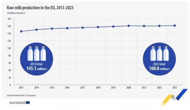 Εκτιμάται ότι οι κτηνοτροφικές εκμεταλλεύσεις στην Ευρωπαϊκή Ένωση (ΕΕ) θα παράγουν 160,8 εκατομμύρια τόνους νωπού γάλακτος το 2023.