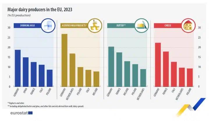 Η Γερμανία ήταν ο μεγαλύτερος παραγωγός πόσιμου γάλακτος στην ΕΕ, αντιπροσωπεύοντας το 19% της συνολικής παραγωγής. Ήταν επίσης ο κύριος παραγωγός οξινισμένων γαλακτοκομικών προϊόντων (27%), βουτύρου (20%) και τυριού (22%).